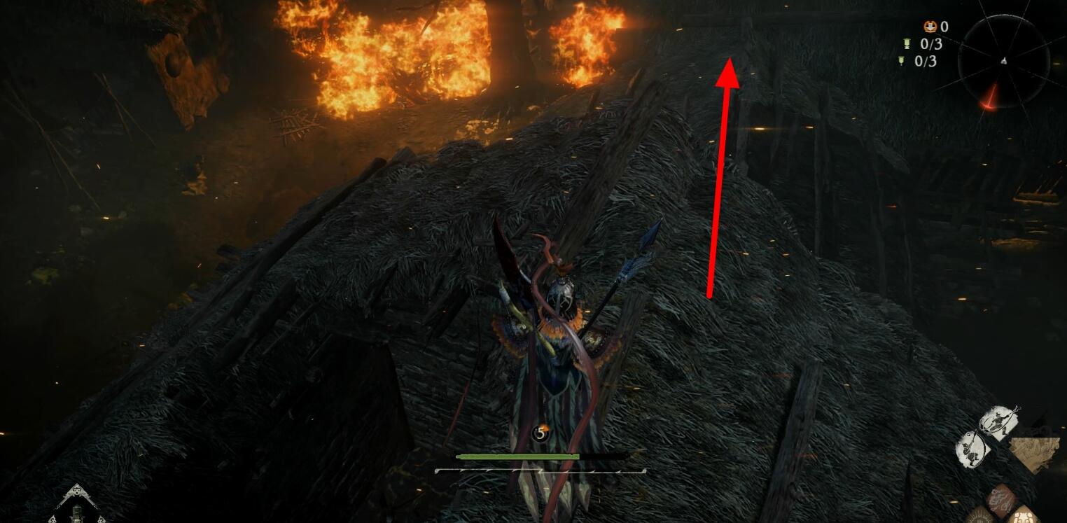 消灭怪物后来到房子后面,通过棚子跳至屋顶。