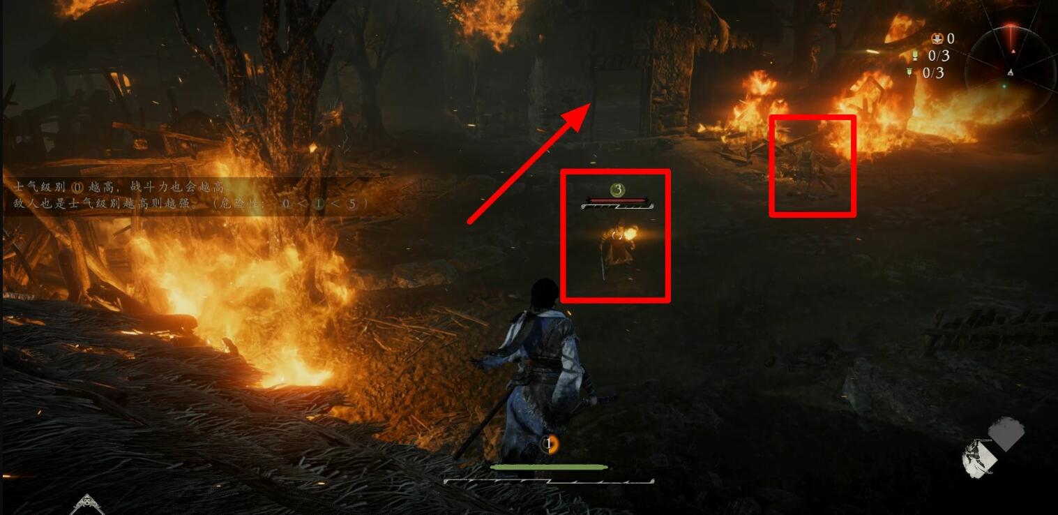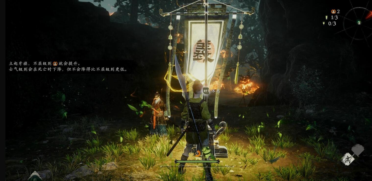 通过台阶向上竖立牙旗(2/3),在牙旗处休息刷新地图上的敌人,然后原路返回消灭刚刚旌旗旁的四名敌人,如此反复刷取来提高士气等级。