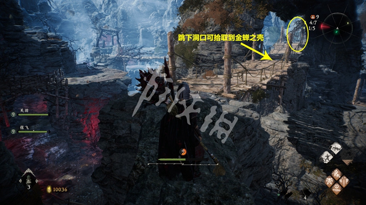 跳上去后,有一座吊桥。吊桥中间有个洞跳下去能找到稀有道具[金蝉之壳]。吊桥走到底能发现一个旌旗点。