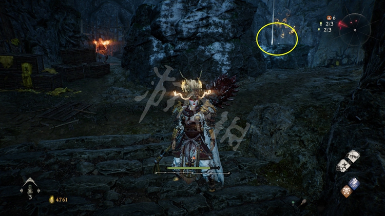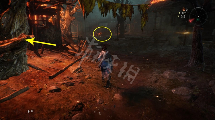 接着往回走,画面左侧大树旁有块木栅可以蹬跳翻过去。游戏中类似可以蹬跳的岩石、墙壁等障碍物都会有明显的白漆涂抹。