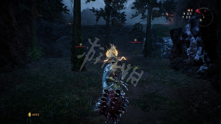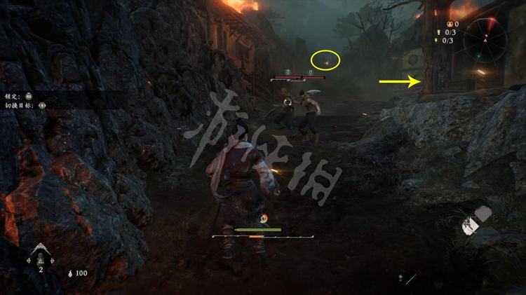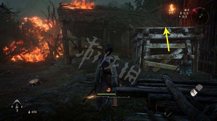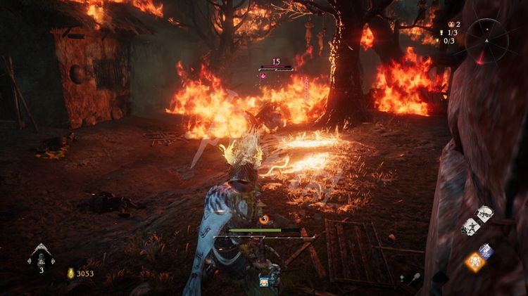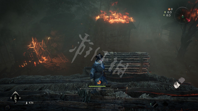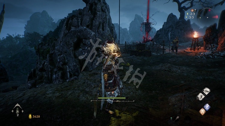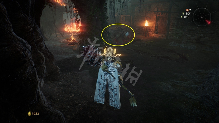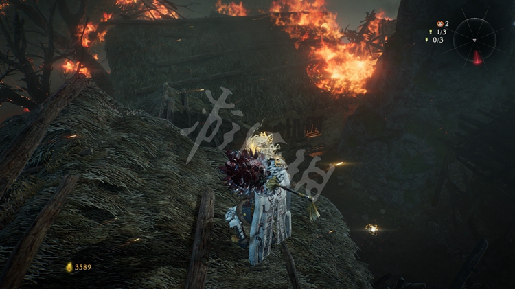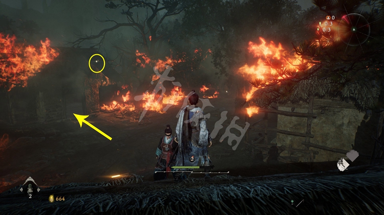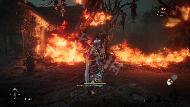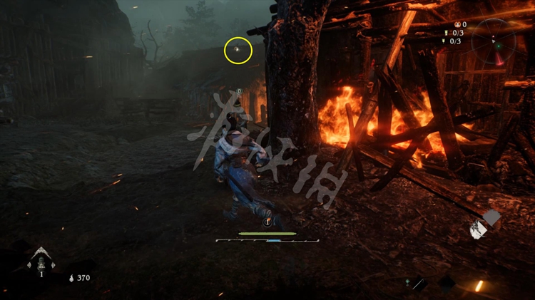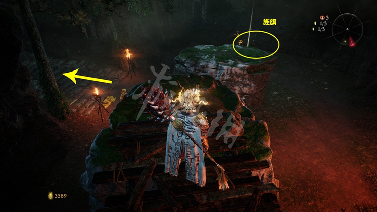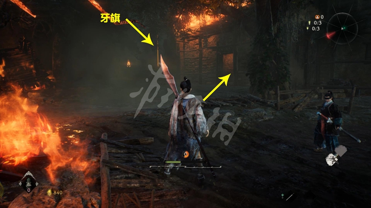屋旁的火堆是可以穿过去的,但注意后面有只士气等级高达15级的“伥鬼”。火焰后面的那块区域和之后的路程是连通的。所以这里不着急过去,先往前走开掉关键的牙旗点。