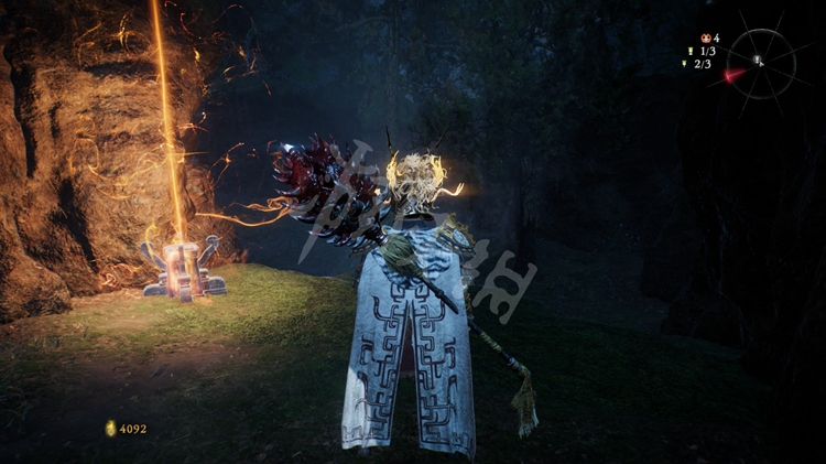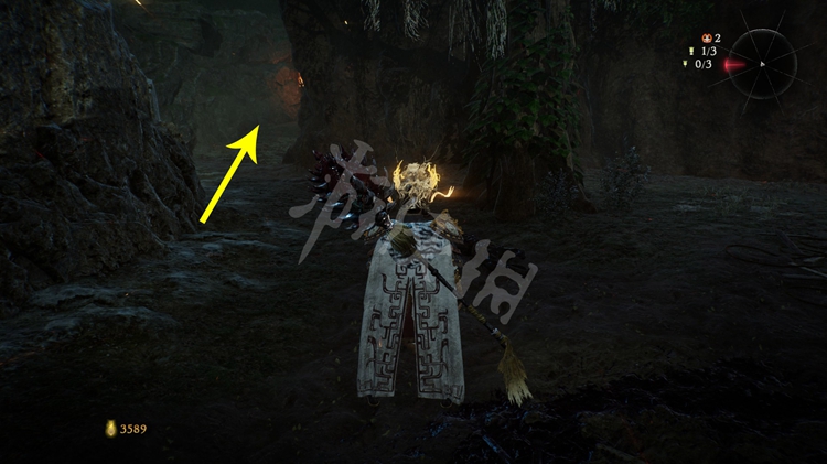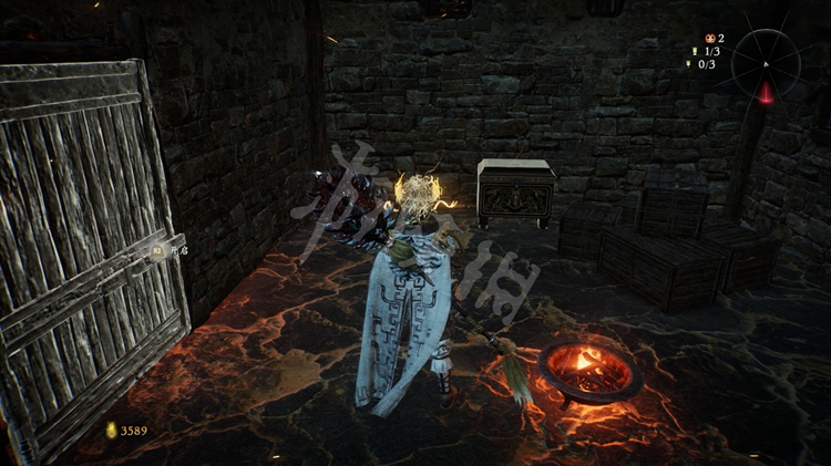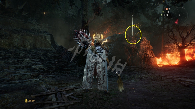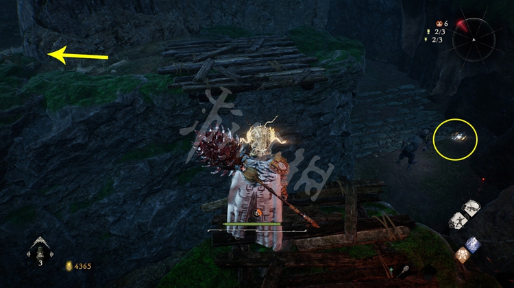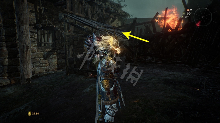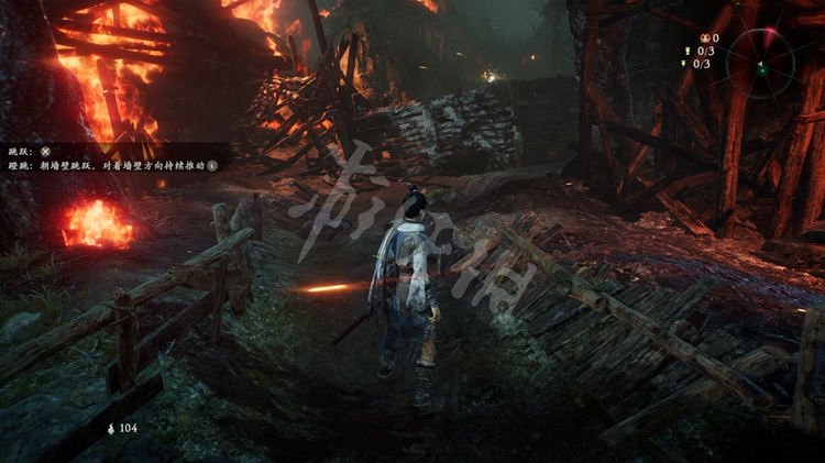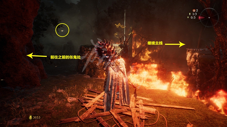 继续往前走,峡谷中到处都是火焰。先跳到第一个台阶上,接下来可以选择先往左边走,左侧的堆着几个木箱的小道通往上文提到的“伥鬼”那儿。