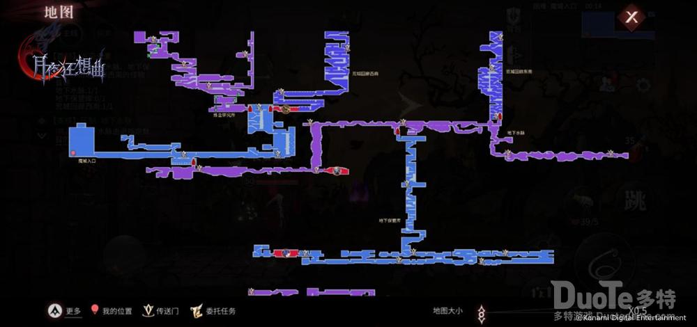 《月夜狂想曲》的大地图这一次研发《Castlevania》IP的手机《月夜狂想曲》,虽然采用了3D的模型与场景,但游戏的核心依旧是最为经典的2D横版模式。那么,游戏开发的重点便是要在移动平台上还原“银河城”的味道,最大程度的致敬和继承Castlevania系列的经典要素。