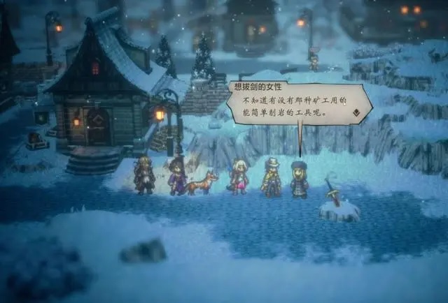 进入凛芬镇后,往地图右边走,和想拔剑的女性对话,触发支线任务“石中剑”。