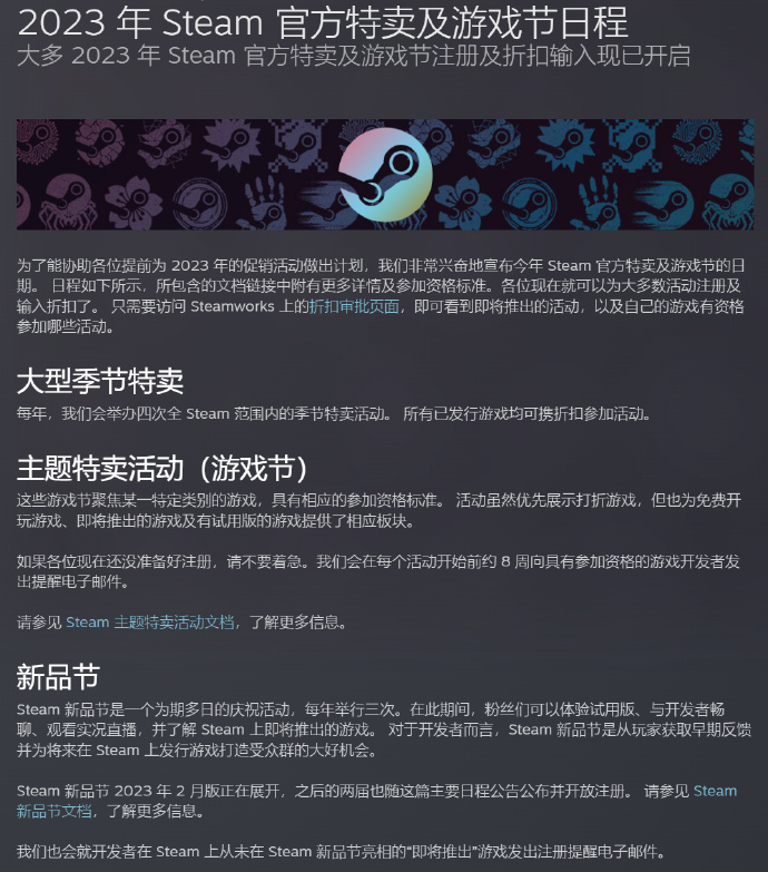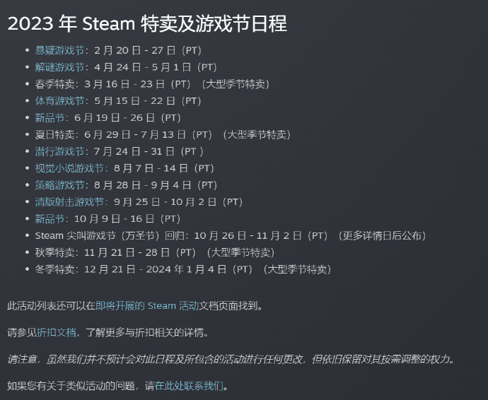 Steam最近公布了在2023年度接下来的官方特卖及游戏节日程,下面小编为大家带来Steam官方特卖及游戏节日程分享,感兴趣的小伙伴一起了解一下吧。