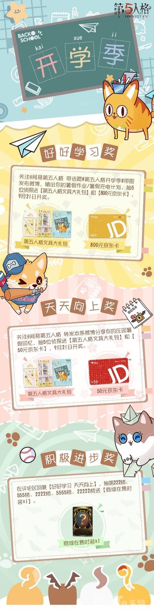 截止9月21日,关注@网易第五人格 并带标签#第五人格开学季#晒出你的暑假作业或暑假充电计划,展示你在暑期收获的丰硕成果,就有机会获得好好学习奖,领走属于你的第五人格文具大礼包和800元京东卡;关注@网易第五人格 并转发指定微博,分享自己在庄园里的暑假回忆,则有机会赢得天天向上奖,获得第五人格文具大礼包和50元京东卡奖励。