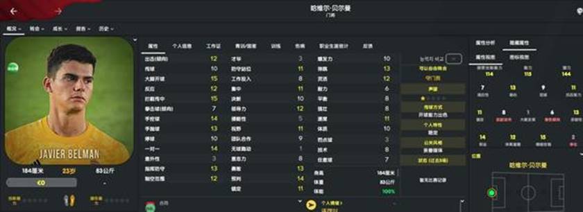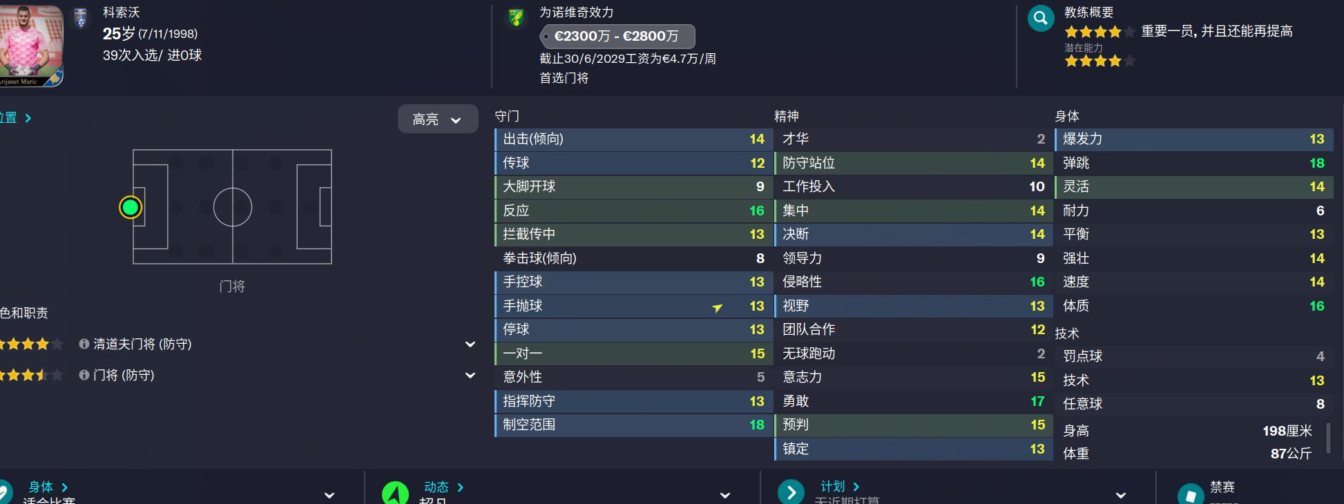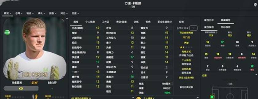 性价比非常不错的一名年轻门将,职业只有7但是雄心和意志力双高,练起来应该问题不大。