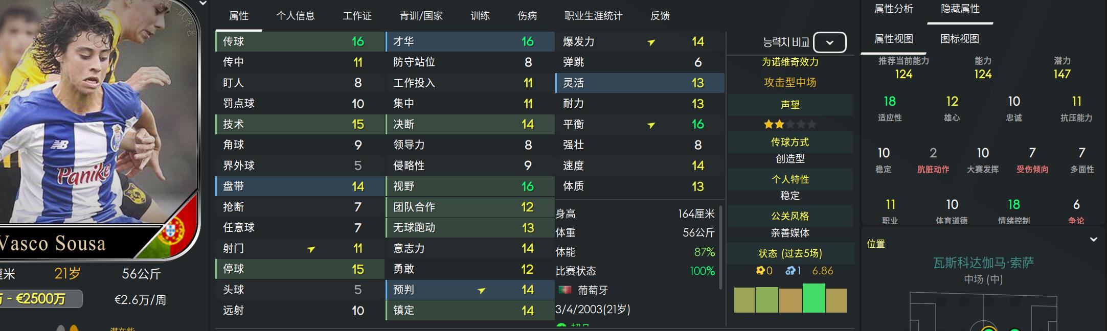 波尔图二队中场,瓦斯科达伽马·索萨,164cm,开档200万能来,这个属性分配是真的无敌,120ca,比有些140ca分配的都强。
