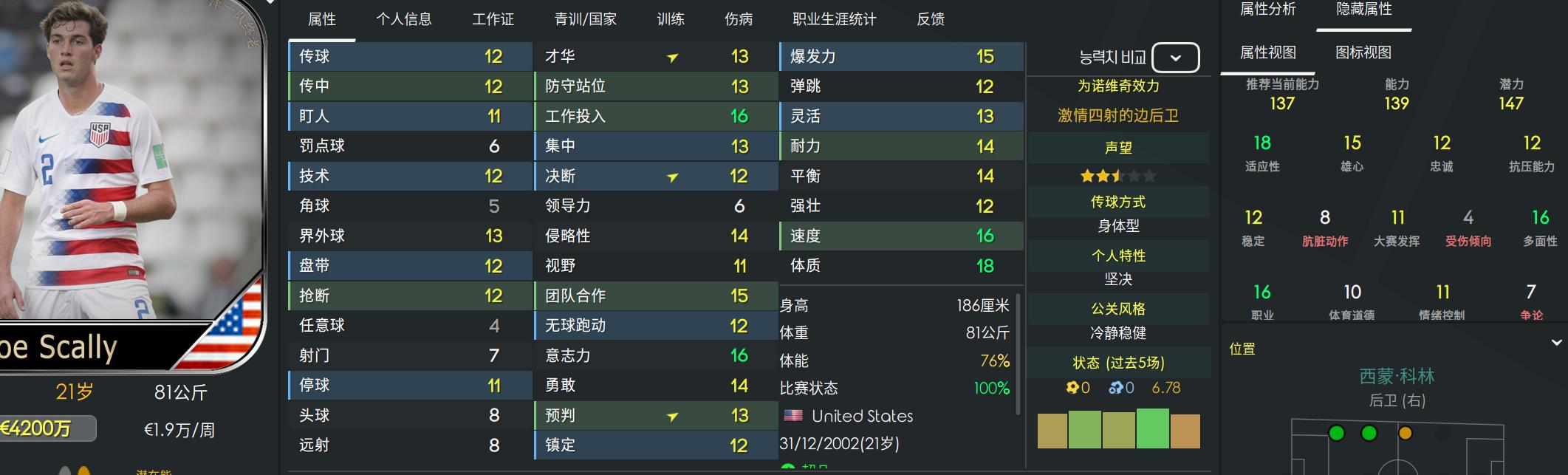 性价比非常高的一名右边后卫,同样是练满可以毕业的级别。一般次级别的中游球队都能签,简直不要太香。