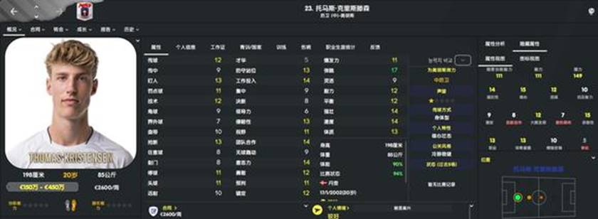 性价比非常!非常!非常高的一名右边后卫,开局足够即战力,固定潜力150。但是由于开档ca足够高,一般的小球队是买不到的,建议顶级联赛的球队买,或者诺维奇、伯恩利这种声望高的次级别豪门。