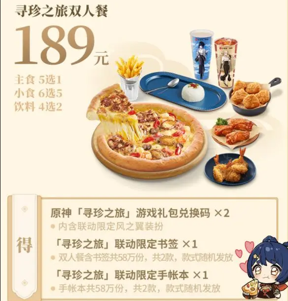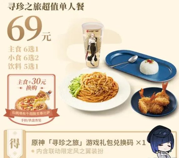 接下来就是吃了,联动的包装都是凝光和夜兰的主题,单人餐就是主食、2个小吃,还有饮料,你加个小月卡的预算能换成披萨。这个只能拿游戏兑换码礼包。