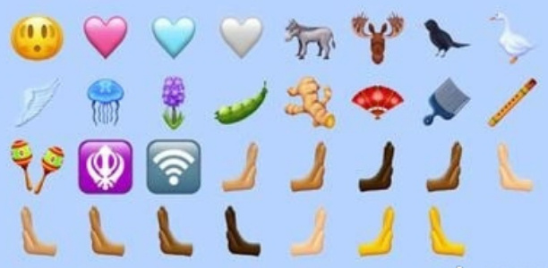 新的表情符号选项包括摇头、粉红色的心、蓝色的心、灰色的心、驴子、驼鹿、黑鸟、鹅、翅膀、水母、风信子、豌豆荚、姜、扇子、梳子、笛子、马拉卡斯,以及一些面向左手和右手的选项。