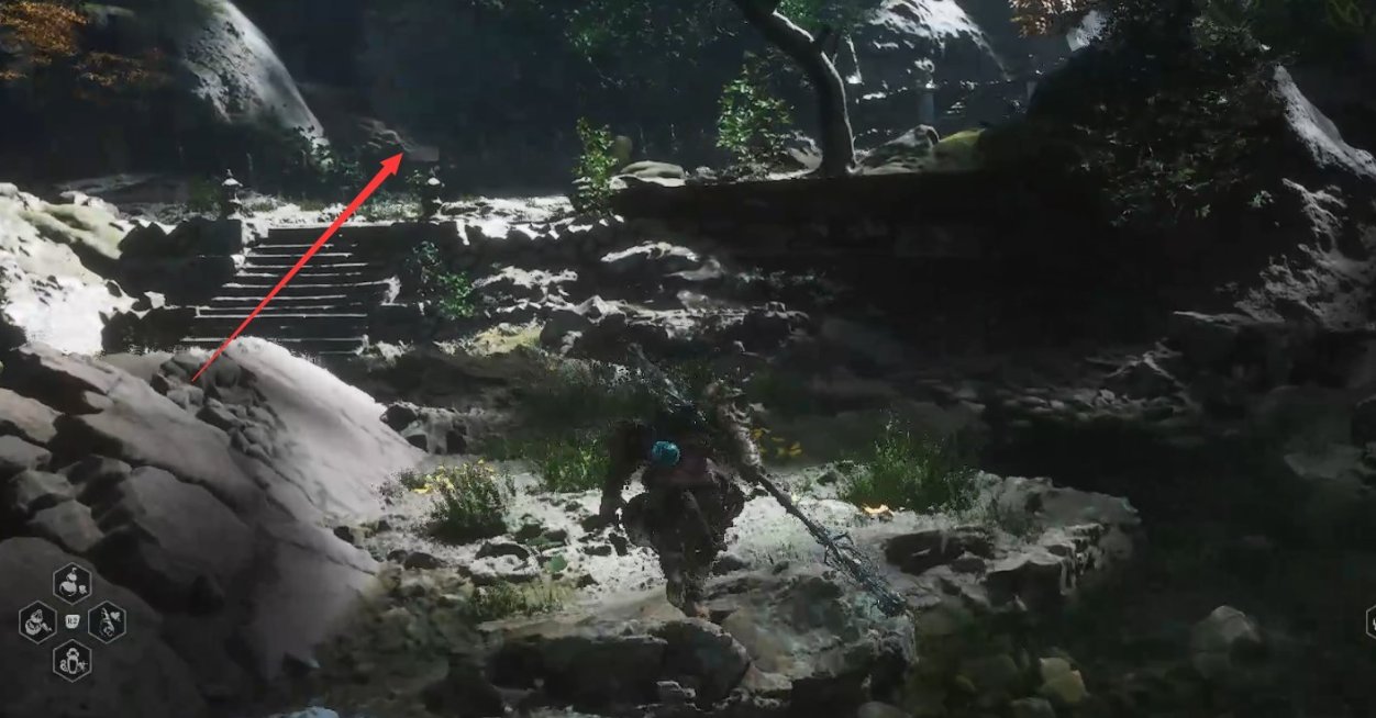 1、经过土地庙,走上长长的阶梯,进门来到个院子。院子中间的粗树下有个宝箱。