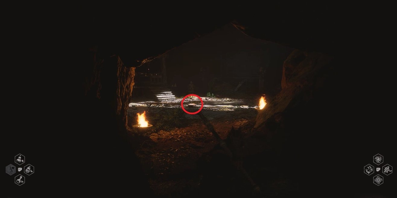 这是本作的第一个蒲团,从初始地点一路走过来就能看到,靠近会有互动提示。后续查漏补缺的话,从第一回【苍狼林-林外】篝火出发,往回走进山洞。