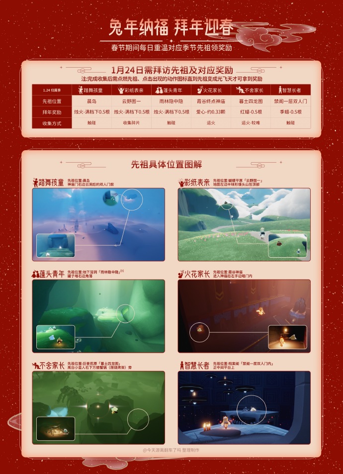 光遇在兔年新春,每天都可以拜访特定的先祖获得奖励,可能还有的小伙伴不知道1.24的拜访先祖位置在哪里的,感兴趣的话那么下面一起来看看光遇1.24拜访先祖位置2023吧。