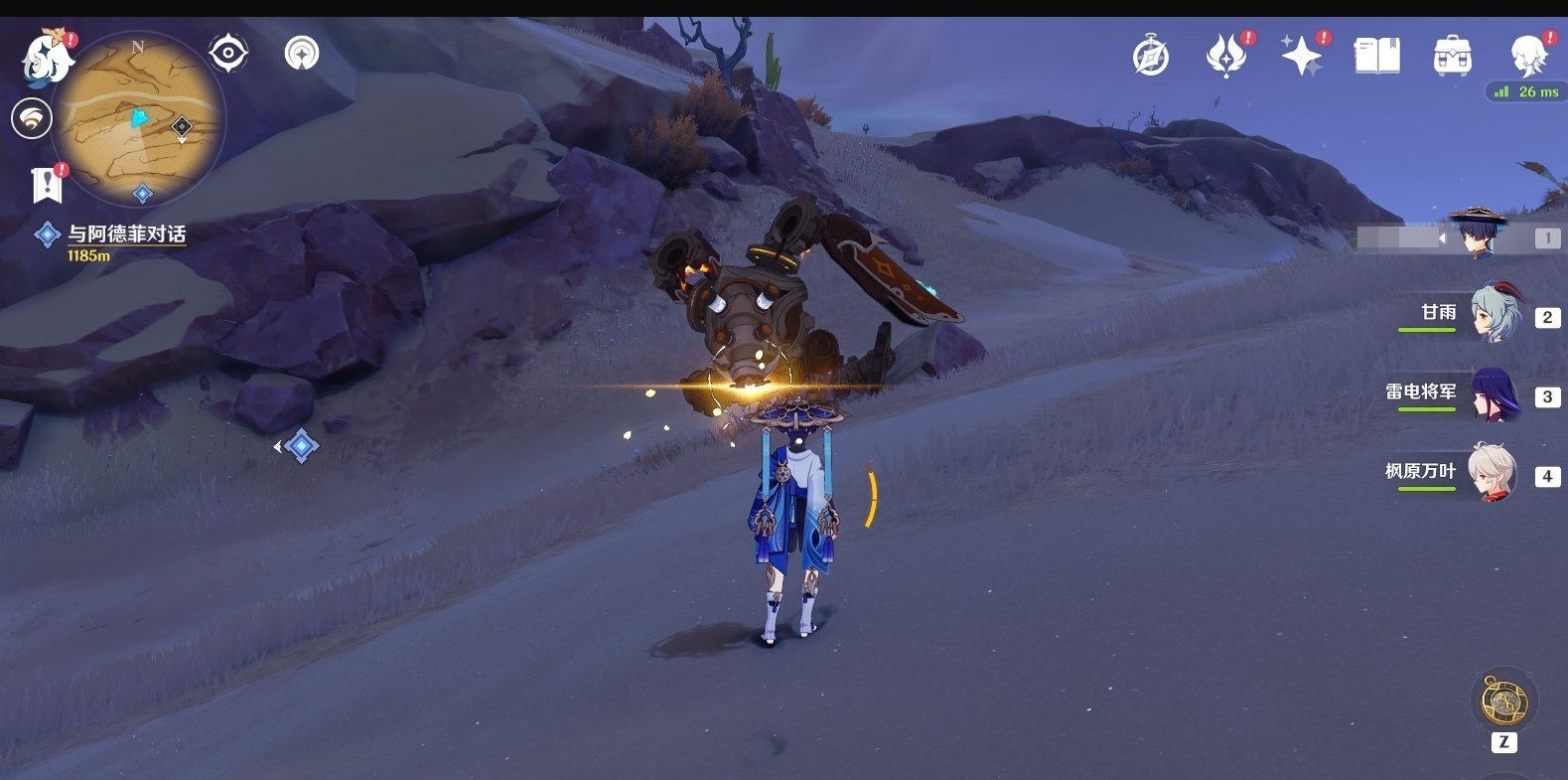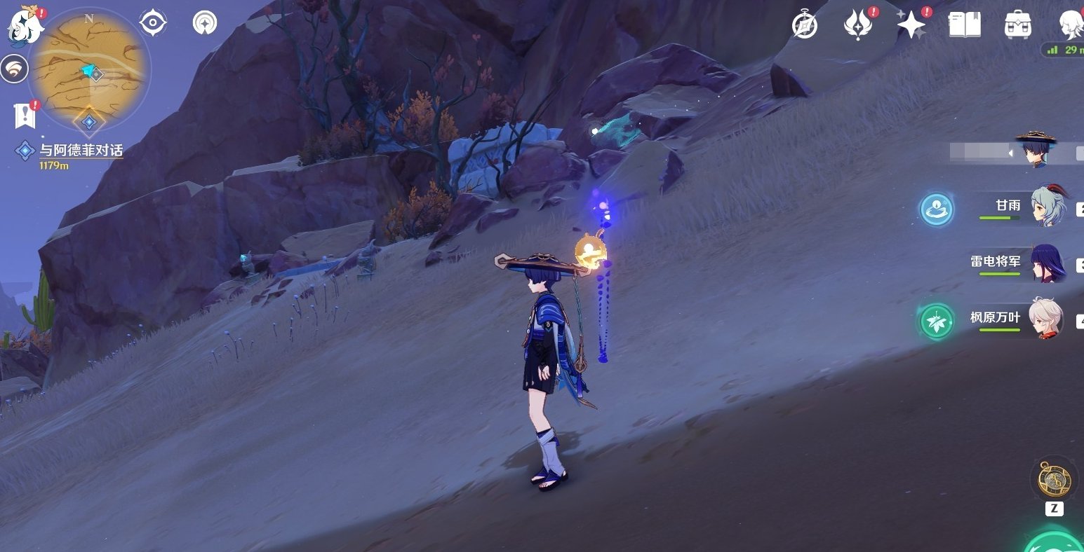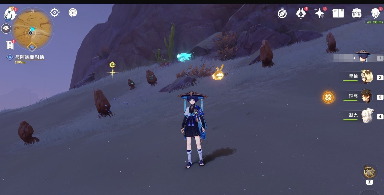 第二只仙灵的位置在秘境另一侧的高台上(高台边缘有个四叶印帮助移动),参考下图中的小地图位置,到达该位置附近可以看到一只遗迹龙兽空巡,仙灵就在它旁边。