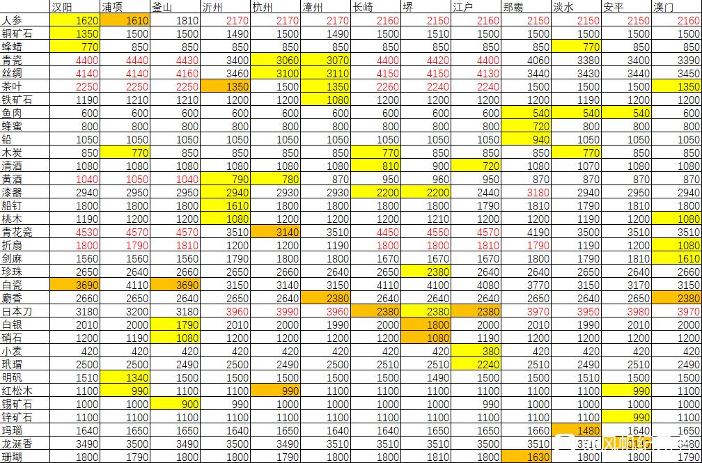 下图就是风帆纪元东亚地区的特产物价,希望对大家有所帮助