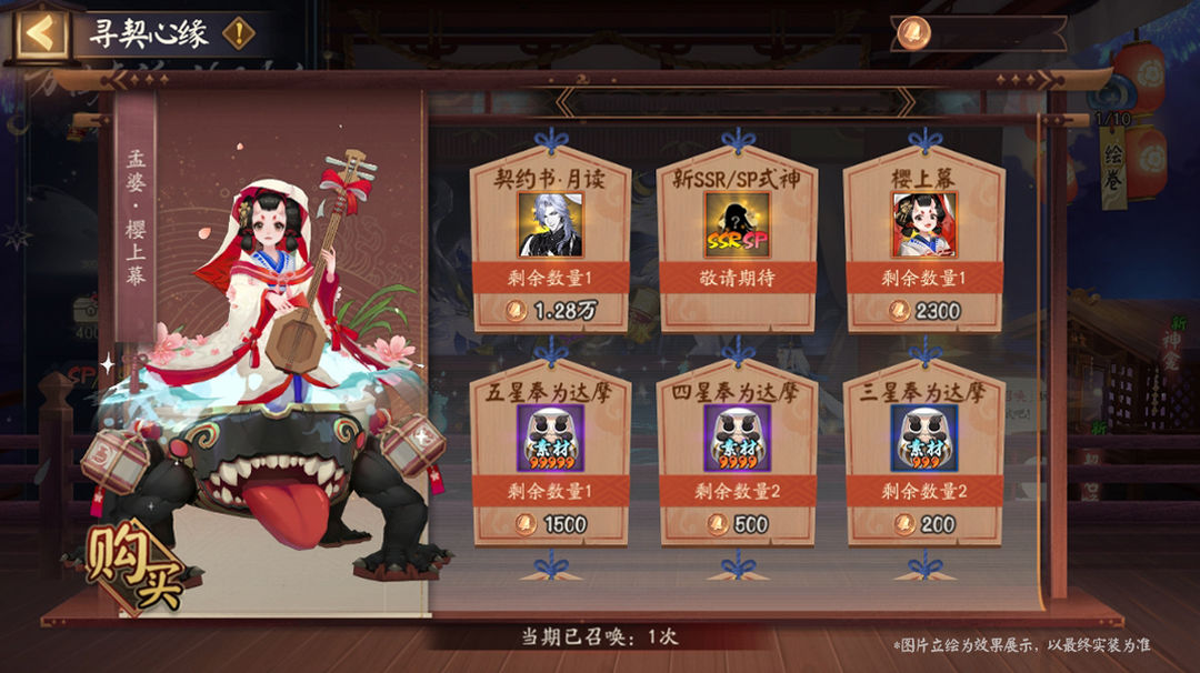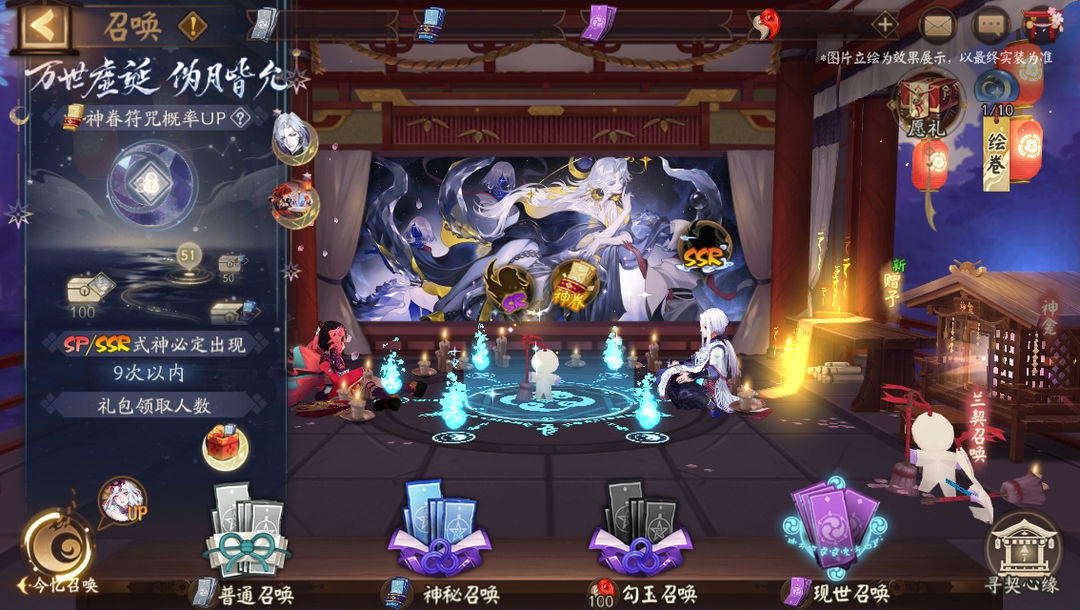 而金票的入手也进行了优化,真假全图鉴,450抽必出。非全图鉴玩家800抽必出。而本次召唤活动,在达到250/400次的时候必定能出随机SP式神。