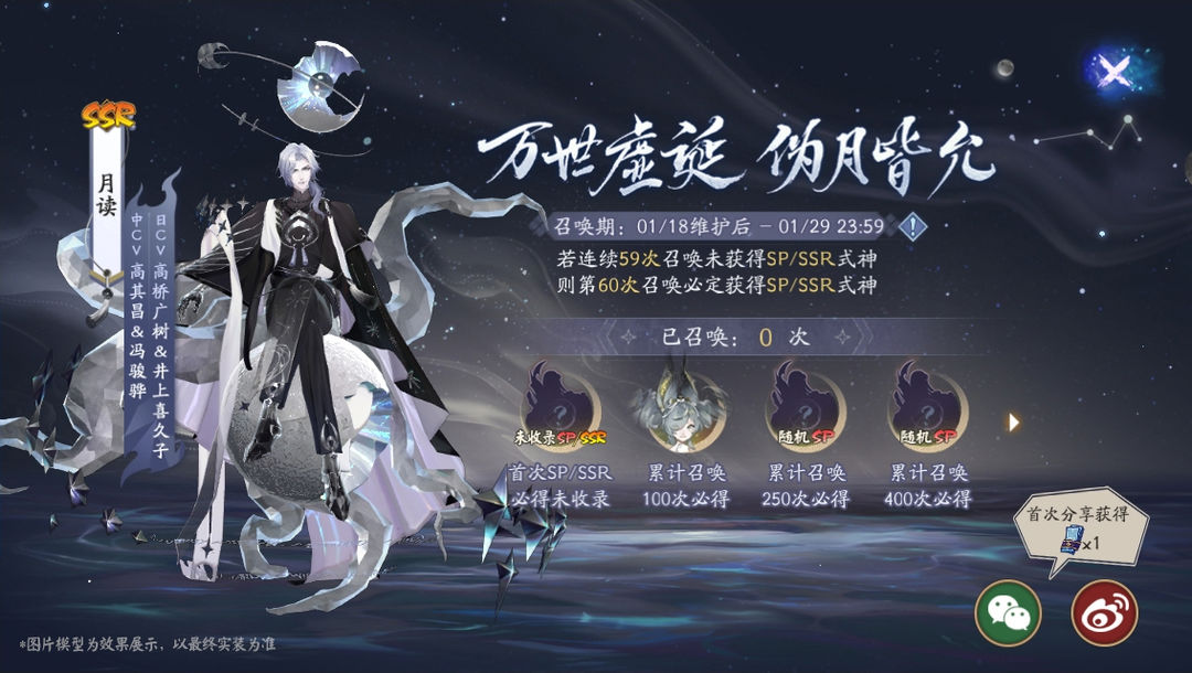 然后是金票这个机制说明一下,玩家可以用金票在1月18日维护后-1月29日23:59期间内,自选1个当前卡池中的SP/SSR式神(包括月读,但是联动、两面佛和追月不行)
