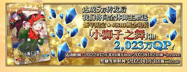 ④官方指定动态达成5万转发,可以获得2023万QP和一张四星纪念礼装,礼装效果为自身NP获得量提升15%。