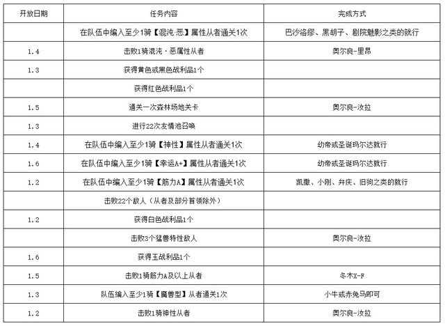 具体任务的开放时间、任务内容和完成方式如上图,战利品的获得正常都是技能石、棋子就能完成,一般在打这些本的时候是可以获得的,如果不能的话就去刷一刷修炼场。