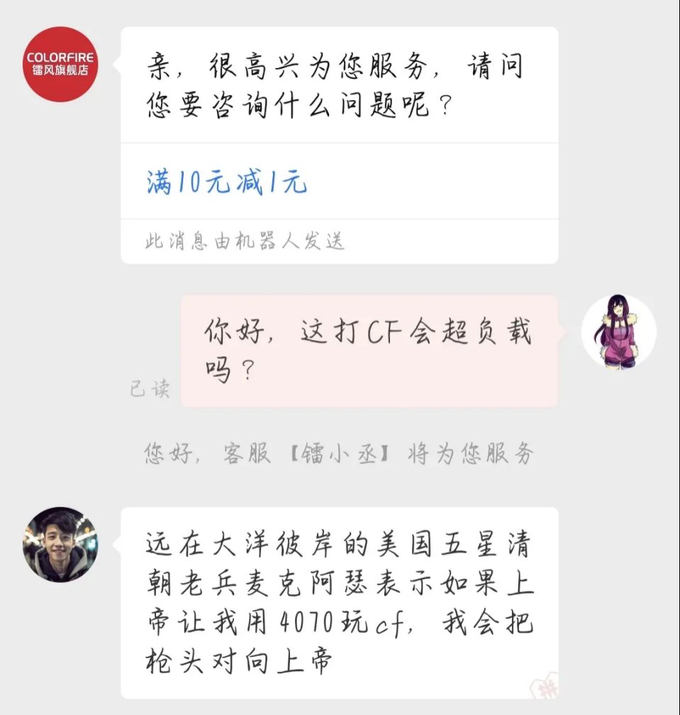 至于到底哪种情况才是答案,我就不妄下评论了,但网友们可就来劲了,纷纷去各大店铺问:我想买4070显卡,请问可以带动我高贵的CF吗?——客服店家们回复的到还挺配合,颇有点《DNF》玩家买西服打团那时的味道了。