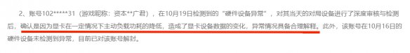 因为开挂在所有竞技游戏中都属于敏感操作,这事被捅到官方那里也不奇怪,随后腾讯对资本家战队的几人进行了封禁调查,但没多久,就宣布解封,而给出的解释大概翻译过来就是:我们进行了远程排查,是显卡(4070)带不动CF,所以才造成了满载的数据异常。