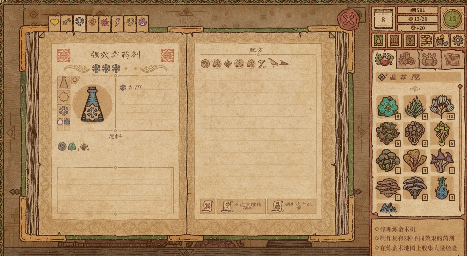 游戏中玩家将成为一名中世纪的神秘炼金术师,使用树叶、鲜花、浆果、根茎、水果、矿物和各种的蘑菇等原料研磨制作功能不同的药水,与寻求解决问题的客人交易,满足不同顾客需求,获得财富和影响力。