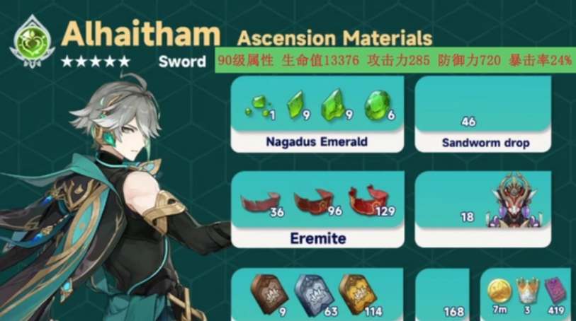 4. 艾尔海森这个角色作为草元素主C强度还是非常值得肯定的,如果玩家们想要培养的话可以先收集准备一部分材料。