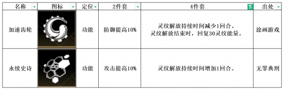 效果非常直接的对灵纹解放持续时间延长,一方面增加了“灵纹解放中”的技能效果的覆盖率,另一方面等于减少需要开启灵纹解放的次数,一定程度上变相降低了对灵纹能量的需求量。需要在灵纹解放中获得buff或其他收益的角色都可以使用。