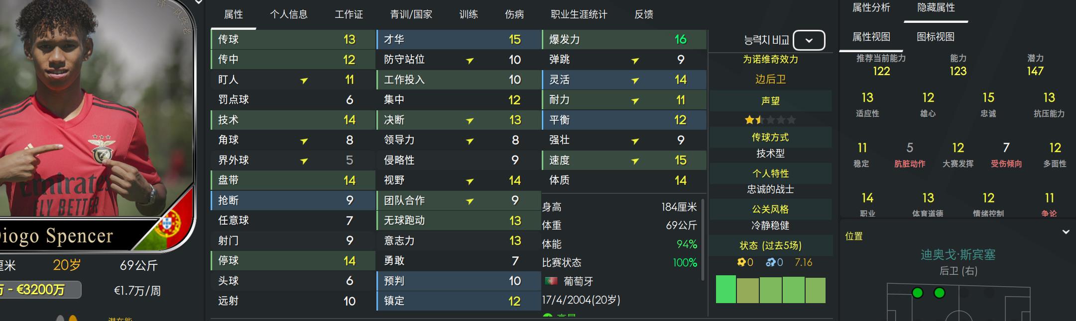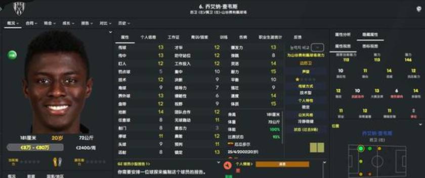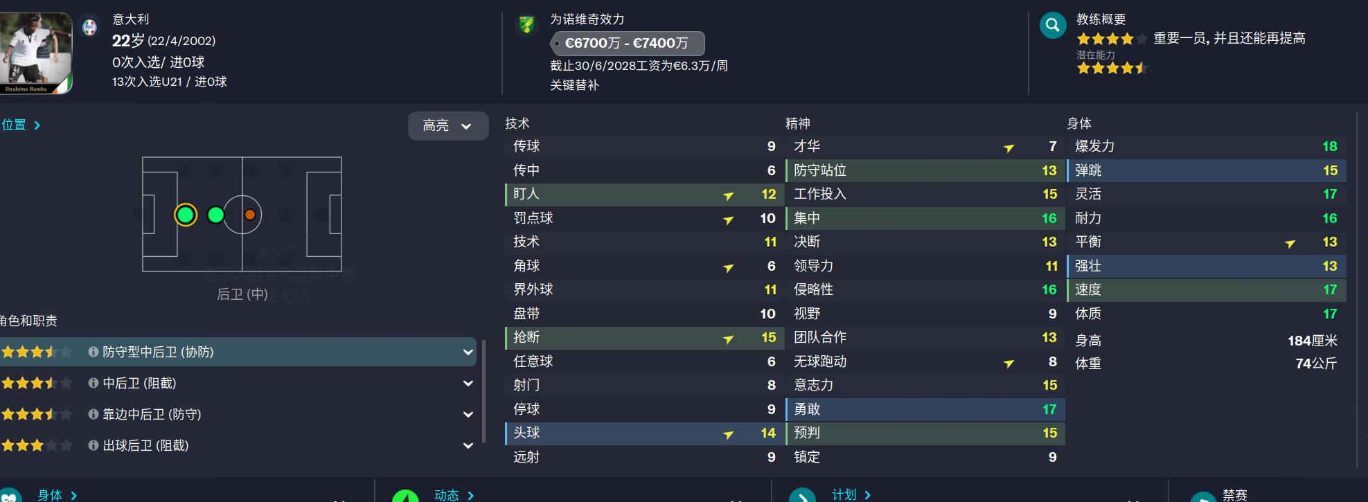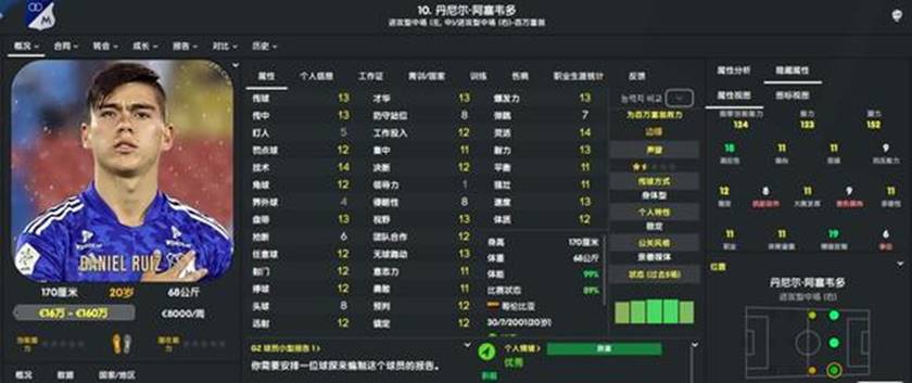 性价比超级高的一名边路球员,能左能右,年龄不大但是潜力很高。潜力高达-8.5,最高可以随到170,直接毕业。