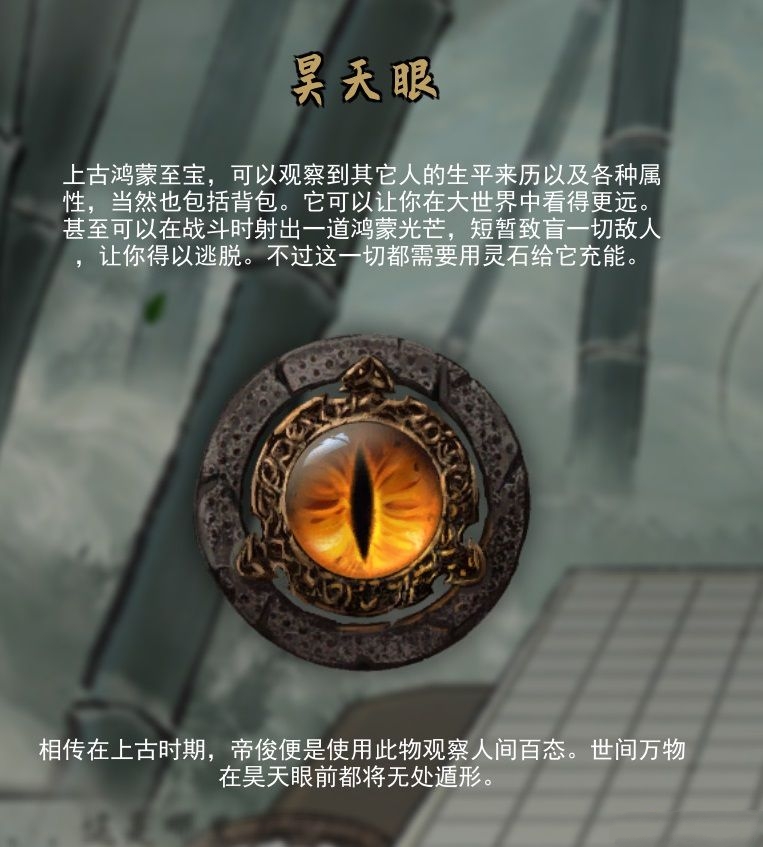 昊天眼的功能意义非凡,可以在世界中拥有更大的视野,不仅可以看到其他修士的生平来历/属性/背包,还能致盲一切敌人得以逃脱。