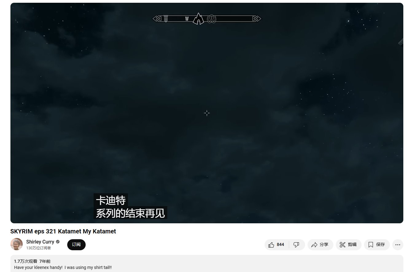 具体到视频内容里面就更朴素了,没有定制的片头和片尾,也没有华丽的剪辑效果和搞怪的BGM,有的只有她在片头片尾坚持说了数年的“Hi,grandkids”和“Bye,grandkids”以及那全程能让人感到放松的安心感。实际上来看天际奶奶视频的人关注的点并不在游戏上,大多数人想看到的是天际奶奶这么一个没有多少游戏经验的人在初次体验游戏的时候会做出怎么样的反应。比如在经过山洞这类比较狭小的空间时,正常玩家会毫不犹豫地一条道走到底,但是天际奶奶却不同,她会像现实中穿过山洞一样走得非常缓慢,还会时不时地去在意各种游戏内的小细节,可以说别人是在玩游戏,而她是在体验游戏。
