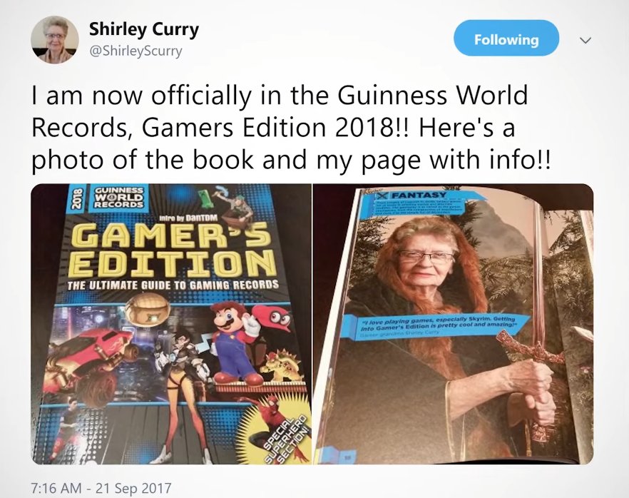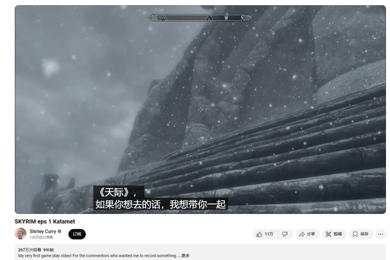 也许雪莉·库里(Shirley Curry)对你我来说是一个陌生的名字,那不妨让我们换一种相对熟悉的说法——她是上古卷轴社区的知名玩家,油管百万博主,吉尼斯世界记录最年老玩家的拥有者,人送外号“天际奶奶”。