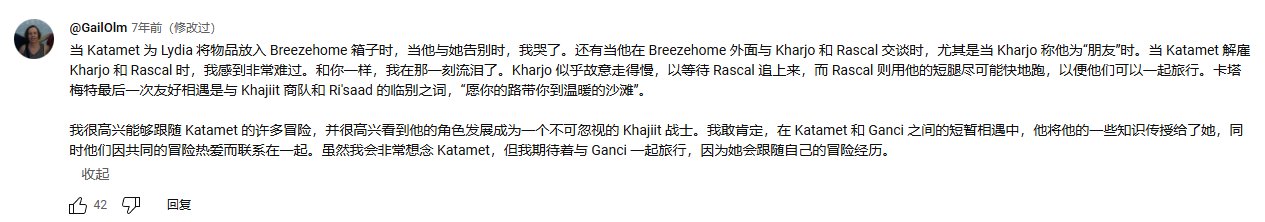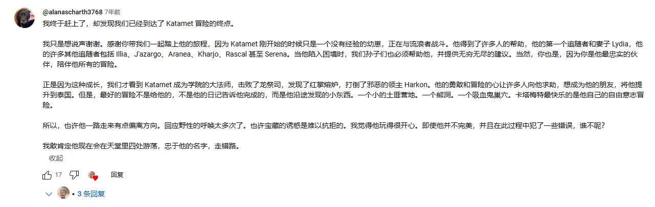 看她游玩就像是在听一部从没听过的故事一样,即便是许多自认为通关了游戏的玩家也能从她这里看到不一样的内容,一路跟下来的观众也是在评论区写起了小作文,对这部名叫“Katamet”的剧集发出了感慨。