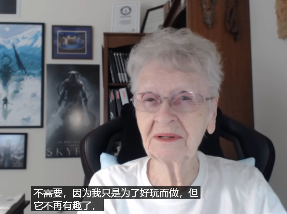 老奶奶今年已经是88岁高龄了,她不仅是目前油管上最年老的youtuber,同时还是吉尼斯世界纪录最年老玩家记录的保持者,在过去的9年时间里她上传了上千部《上古卷轴5》的游戏视频,凭借着独特的游玩风格以及对游戏最原始的热爱让她的频道收获了百万粉丝。