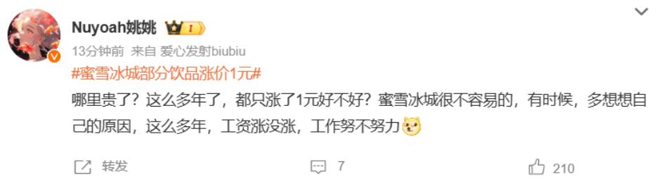 每当蜜雪冰城出现这种比较负面的消息上热搜时,我都会特意翻一翻评论,不为别的,因为评论区大概率会变为网友们一边维护雪王,一边拷打“其他涨价商品”的大型处刑现场,乐子很足。
