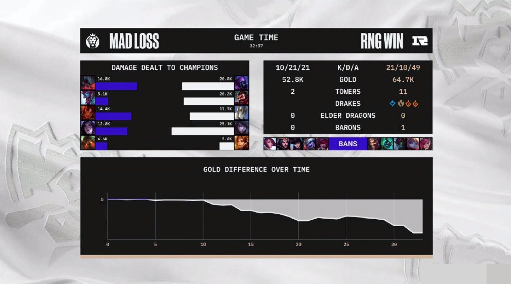 前期MAD凭借巨魔的强势让RNG稍显头疼,但随后RNG男枪收获3个人头后,胜利的天平便倾向RNG一方。后续MAD剑魔发育良好,多次挽回队伍颓势,但最后RNG仍毫无悬念拿下比赛。