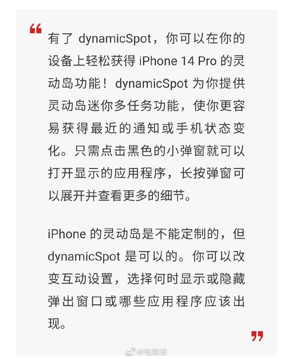 据MacRumors报道,一款模仿苹果iPhone 14 Pro系列中“灵动岛”UI设计的App已出现在Google Play商店中,名为“dynamicSpot”,支持Android手机体验。根据开发者的描述,在当前形式下,dynamicSpot提供歌曲、计时器、电池状态的播放控制,还将推出更多功能。包括苹果“灵动岛”所没有的个性化定制功能。