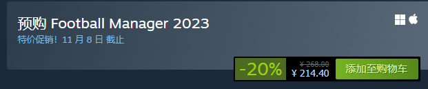 足球经理2023已经开启了预购,本作的售价为268元,预购可以拥有20%的折扣