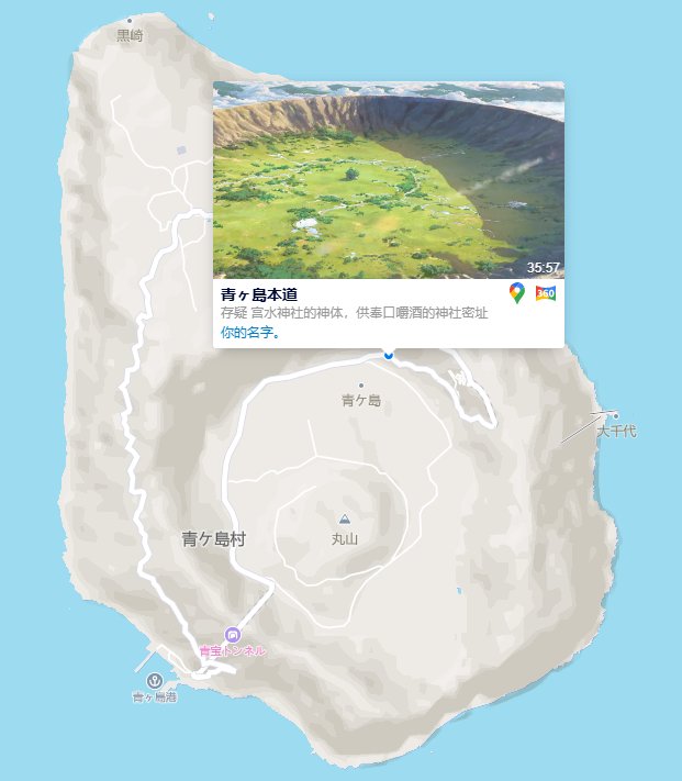 其实像这种偏远地区的打卡点还有很多,比如我圈出来的这个点,这是一个小到不放大看都看不到全貌的偏远小岛,但这里却有着《你的名字》中宫水神社的取景点,虽然在地图上标注的是存疑,但是看整体的地貌和原版剧集中描绘的地理位置,似乎又有几分相似之处。