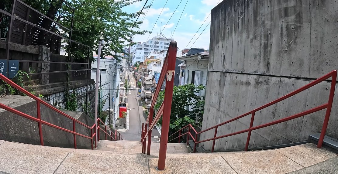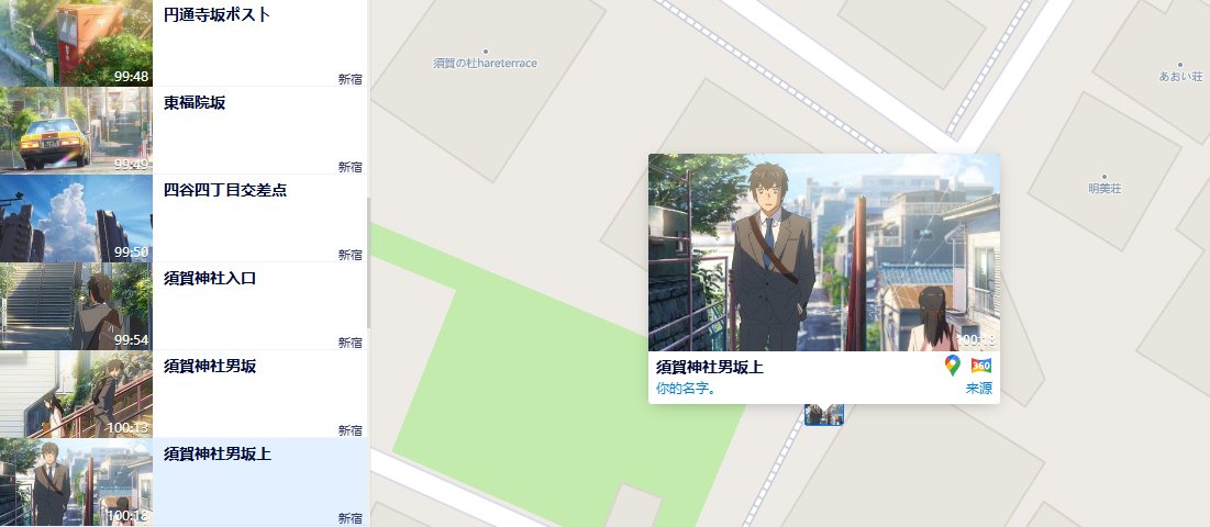既然都提到了《你的名字》,那就不得不去看最后一幕男女主上下楼梯的那个地点,只要点击作品名字就能在地图左边列举出来所有已知的取景点,就在新宿区若葉附近的这个位置。