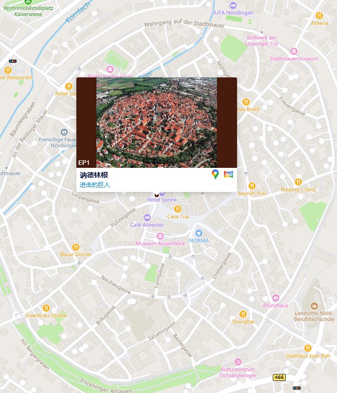 如果我们放眼全世界,那些刻在DNA里的场景在这个地图软件中一样也能见到,在德国巴伐利亚州西部的讷德林根,你能见到《进击的巨人》中城堡的原型。