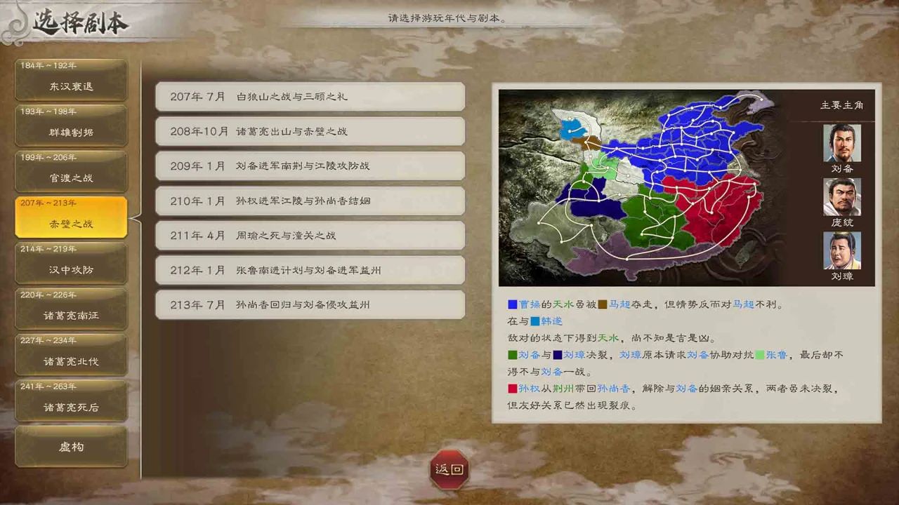 例如「赤壁之战」从公元207~213年,一年一个分了七个剧本。涵盖了“三顾茅庐”到“刘备入蜀”时间线。玩家既可以选择直接从“赤壁决战”的阶段开局,也能跳过之前的年份节点从“孙刘联姻”时期开始体验。