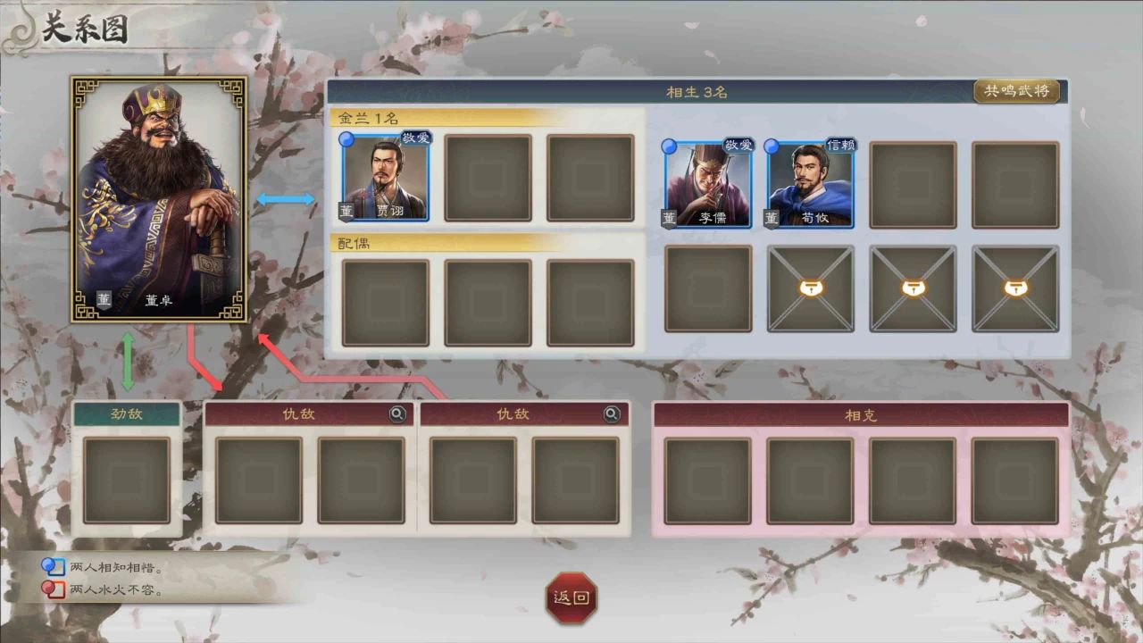 结成金兰或是配偶的武将会自动获得「相生」关系,金兰、配偶武将不占据相生名额