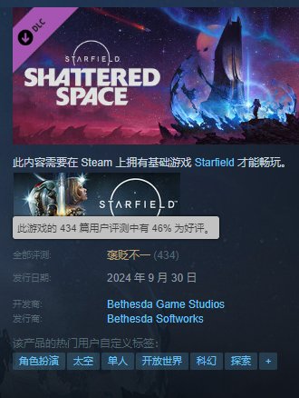 《星空》DLC“破碎空间”现已正式推出,Steam评价“褒贬不一”,好评率仅为47%。