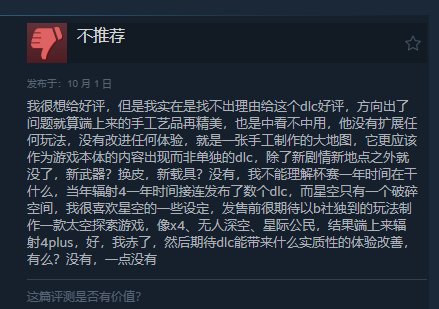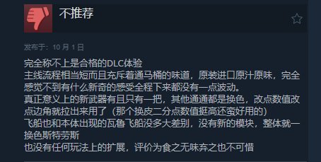 给出差评的玩家指出,DLC各种“通马桶”任务还是和本体中的一样无聊,没有瓦鲁专属新飞船模块和新载具,太空内容也不是很多。