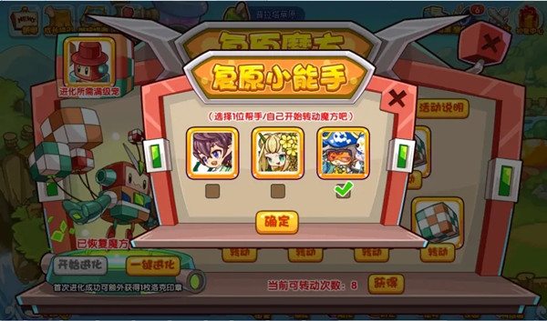 帮助飞天方方复原所有被打乱的魔方吧,复原成功即可完成活动获得“飞天方方”的进化机会。