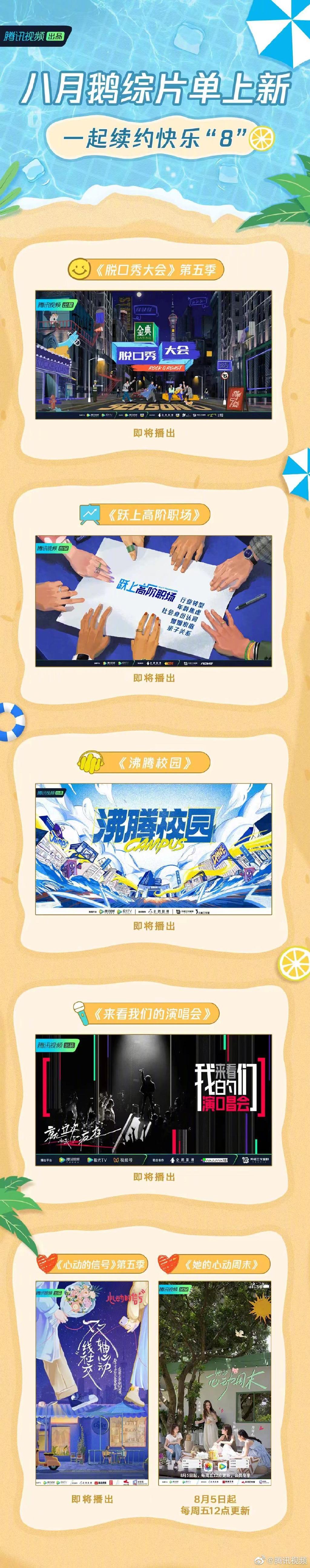 鹅厂8月综艺片单上新了,脱口秀、音乐舞台、情感关系、职场生活等类型综艺总有一款戳中你,下面就一起来看看具体的片单分享吧,感兴趣的小伙伴千万不要错过哦。