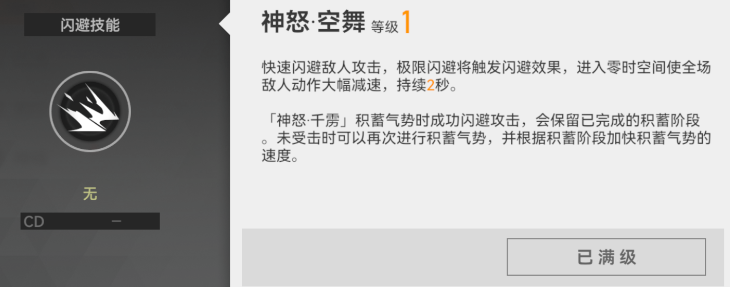 闪避后进入零时空间2秒,当三技能【神怒·千雳】蓄力期间触发闪避效果时,会继续蓄力并加快蓄力速度。